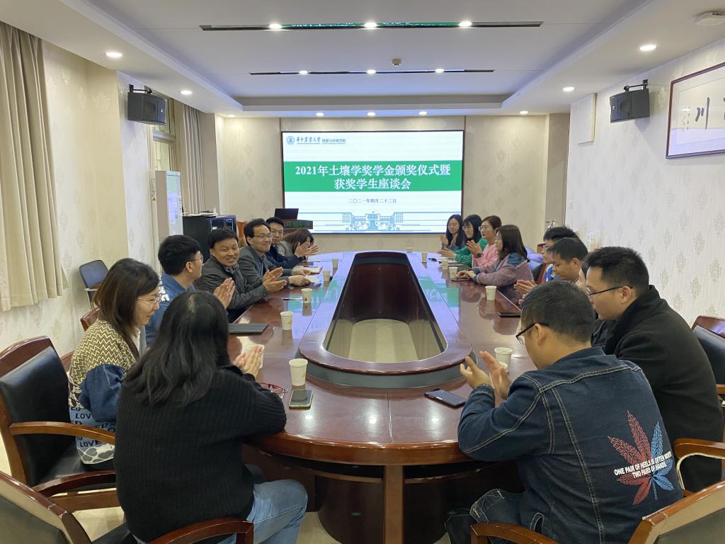 4月22日上午,学院2021年土壤学奖学金颁奖仪式暨获奖学生座谈会在资环楼204举行,学院党委副书记熊海林,土壤学奖学金管理委员会秘书胡红青教授出席颁奖仪式,研究生辅导员胡志宏主持颁奖仪式。
