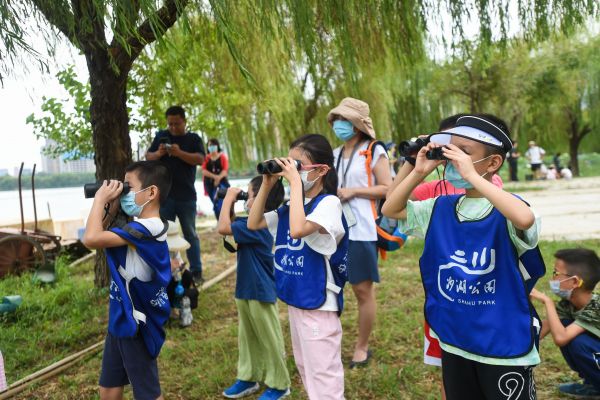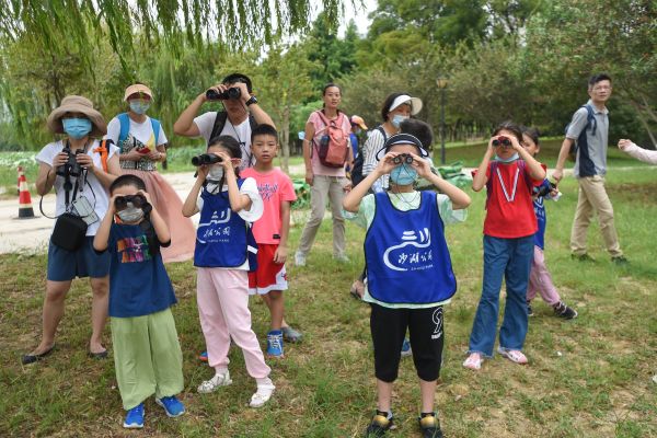 同学们观察湖面夜鹭。记者许魏巍 摄