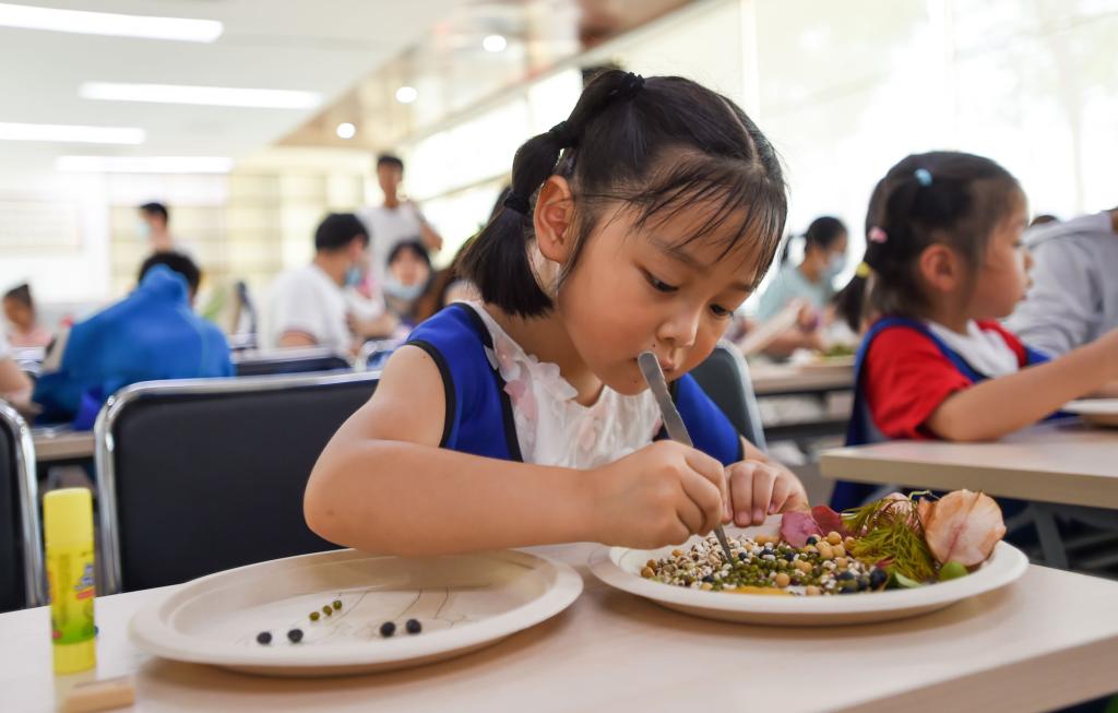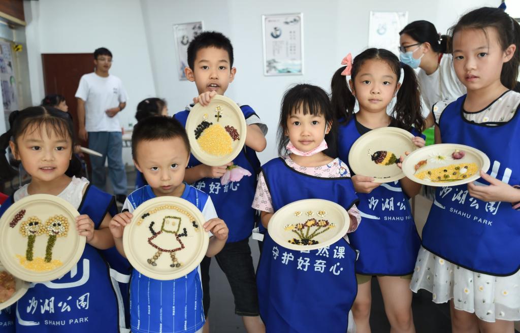 小朋友用植物种子作画。记者 许魏巍 摄