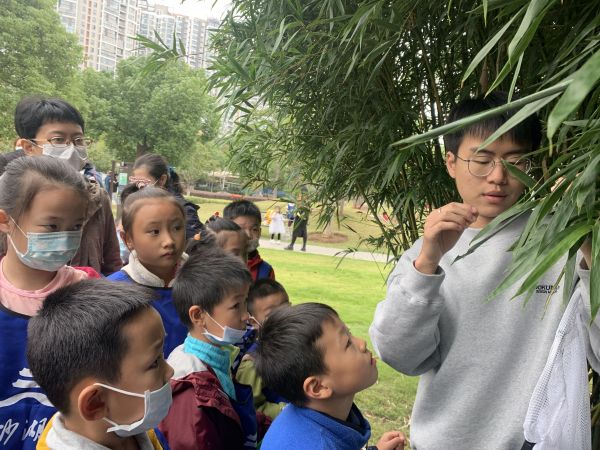 一队人且行且停,忽然在竹林后发现了惊喜。“看,这是卷叶蛾的幼虫。”刘如达轻轻将竹叶托起,方便同学们观察,“叶蛾的幼虫呈透明状态,没有保护色,需要用叶子保护自己。它们通过吐出白色的细丝,将两片老叶、一片嫩叶连同自己裹起来,相当于给盖了一层被子,当饿了的时候,就可以吃嫩叶,以此来度过寒冬。”刘如达说。