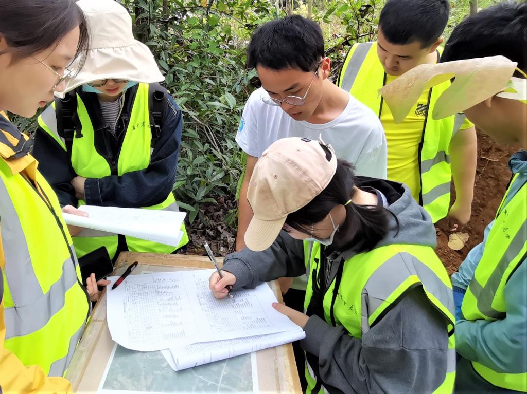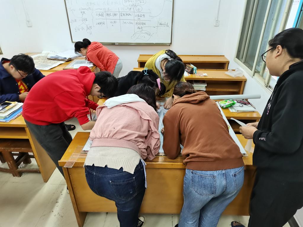 10月31日上午,师生抵达实习基地,朱俊老师就实习地点、内容、时间安排、野外调查技术要点等进行了详细介绍,并向同学们强调了实习期间住宿、餐饮、出行安全等注意事项。随后,分发实习材料及工具、分配调查区域,并对1号调查区路线调查的技术与方法进行示范讲解。