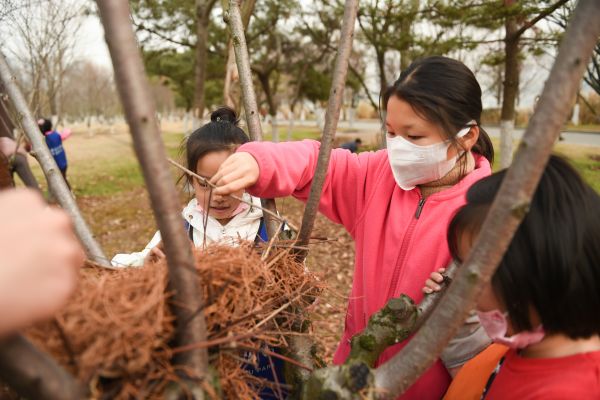 随后,孩子们通过捡拾公园内的枯枝、落叶等自然物料分组搭建鸟巢。付佳煜、田亦辛、张景泰、杨景童组成了四人小队,分工明确后,以粗壮树枝搭建基座、坚韧树条为钢筋、密集的水杉落叶为墙,十分迅速地搭建出了一个硕大而又坚固的鸟巢,还十分艺术地在鸟巢周围装点上好看的芦苇。付佳煜表示,这次他们为共同为鸟儿搭建了一个别墅,希望有鸟儿能够住进来。一边说着,她一边按课上老师讲的内容,在鸟窝“墙壁”上为鸟儿腾出出入口。